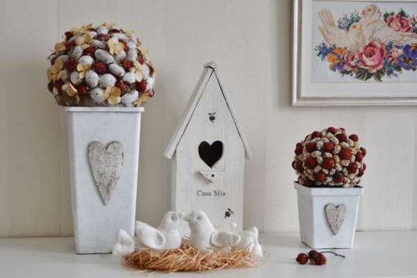 контрастирует с выкрашенными в белый цвет желудями и цветками гортензии в большом шаре. Шар поменьше я украсила теми же плодами шиповника и подкрашенными сушеными плодами шелковицы. Для того чтобы скрыть просветы между элементами, основу можно покрасить в соответствующий тон или заполнить пробелы мхом, сизалем. В кашпо насыпаем камешки или керамзит для устойчивости, верх по желанию декорируем мхом, сеном, сизалем. Осталось только поместить шар в кашпо, зафиксировать клеем и любоваться творением своих рук.