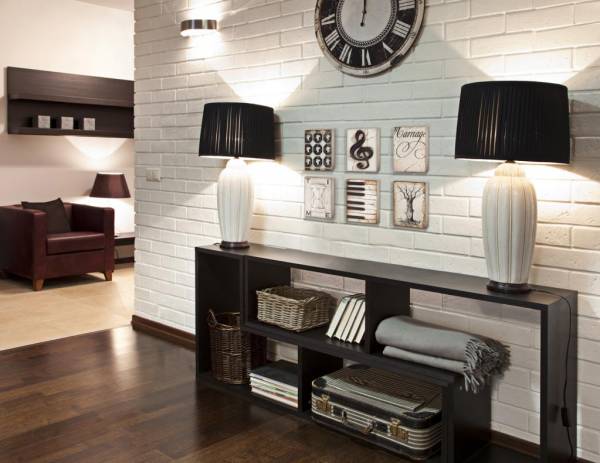 Минусом кирпича считается значительный вес и объем. Если помещение небольшое, то такой материал заберет пространство. Поэтому используются материалы, имитирующие кирпич.