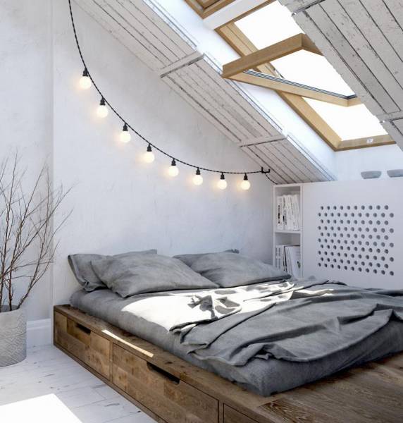 Не менее хорош в спальне мансардного типа северный скандинавский стиль. Он позволит создать невероятно уютное помещение, отличающееся поистине домашней атмосферой, при этом вы не потратите много средств. Дело в том, что отделка и мебель должна быть совсем простой: подойдут штукатурка, дерево, кирпичная кладка, которую следует выкрасить в белый цвет. Все это будет смотреться максимально естественно и невероятно гармонично. К тому же светлые оттенки, характерные для данного стиля, визуально увеличат мансарду. От занавесок можно отказаться — скандинавы предпочитают впускать в дом как можно больше света. Но если без текстиля не обойтись, отдайте предпочтение легким прозрачным тканям.