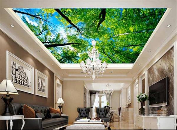 Это очень эффектные потолки, но их не стоит использовать в гостиных с низкими потолками (менее 2,2 метра). Как ни странно, но в этом случае картина произведет обратный эффект – она просто «съест» пространство. Кроме того, следует быть предельно аккуратным с цветовой гаммой и насыщенностью рисунка: слишком контрастный или чрезмерно яркий рисунок будет «давить» на обитателей жилья.