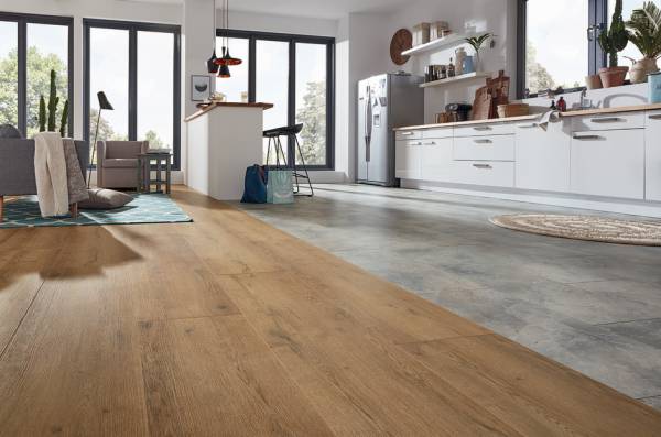 Следует выбирать влагостойкий ламинат, который выполнен по специальной технологии. У него хорошая сопротивляемость к воздействию влаги и к контакту с водой. Этот материал подходит для комнат с повышенной влажностью. Главное, чтобы его класс был не менее 31: он будет соответствовать прочной плитке, к тому же не сотрется раньше нее.