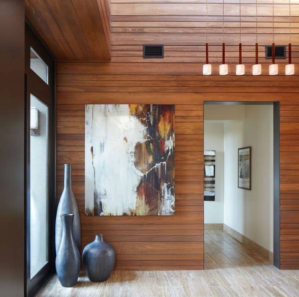 Прием используется в скандинавском стиле, стиле лофт и фьюжн. Одна из стен зашивается фактурными панелями, обработка брусьев подчеркивает структуру древесины. Для усиления эффекта стену подсвечивают акцентным освещением. Остальные стены лучше покрасить в нейтральные цвета, чтобы они не спорили с деревянной поверхностью.