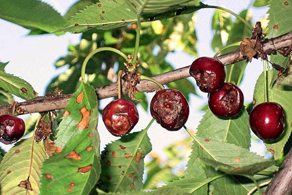Развивающаяся согласно описанию, как на фотографии, болезнь вишни требует срочных мер. В этом случае используют фунгициды комплексного действия или бордоскую жидкость. Полномасштабная обработка проводится в несколько этапов, начиная со стадии зеленого конуса, заканчивая летними днями, когда до сбора урожая остается чуть более 20 дней.