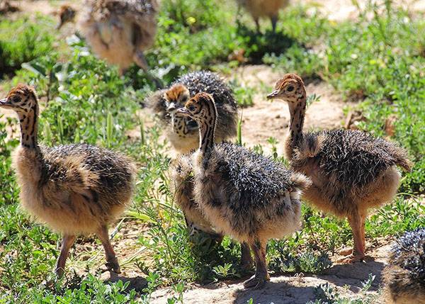 Страусята очень самостоятельные, ведь им не нужно время, чтобы открыть глаза или научиться ходить. Их содержат в птичнике с плотностью 1 птенец на 1 квадратный метр (со временем личное пространство увеличивается до 10 м2). Первые 20 дней держать малышей следует на соломенной подушке.