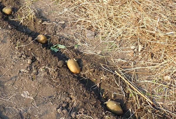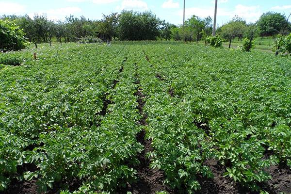 Посадка картофеля производится по стандартной схеме. Клубни размещаются на расстоянии 20 см, между рядом не менее 35 см.