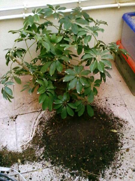 Неоправданно огромный горшок потребует при поливе большего количества воды. Так вы рискуете залить шеффлеру.