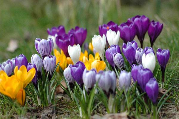 Практически из-под снега появляются венчики крокусов белой, синей, желтой и даже полосатой расцветки. Растения высотой от 7 до 15 см цветут с марта по май, а после увядания цветков уходят на покой. Посадку луковиц проводят в традиционные для весенних луковичных растений сроки, с августа по сентябрь. Лучшее место для крокусов – хорошо освещенные участки или полутень, например, под кронами еще не распустившихся кустарников или деревьев.