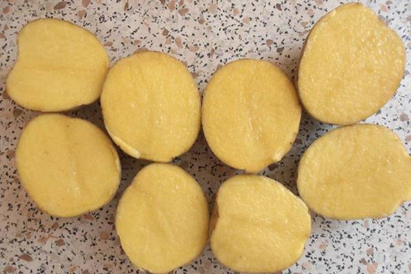 Масса одного клубня варьируется от 100 до 120 г. Клубень округлый или ближе к овальной форме с желтой кожицей средней толщины.