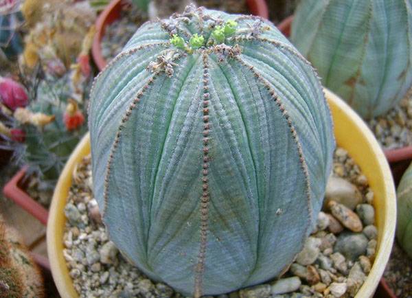 На первый взгляд молочай тучный напоминает кактус или мастерски исполненный японский шар темари, вышитый серебристо-зелеными нитями. На самом деле это ближайший родственник описанного ранее растения. Видоизмененный стебель имеет форму ребристого голубоватого шара с рядами небольших колючек. Зеленые или едва розовые цветки растения расположены в виде венца на вершине.