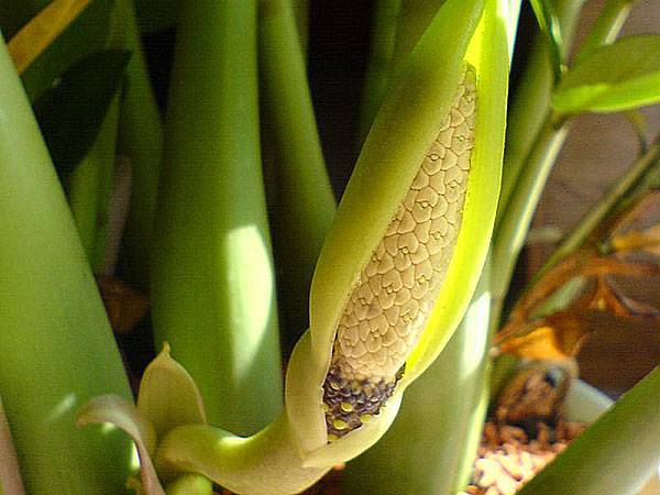 Обычно соцветие скрыто под светло-зеленым покрывалом, поэтому его не сразу можно заметить. На фото хорошо видно долларовое дерево в период своего цветения.