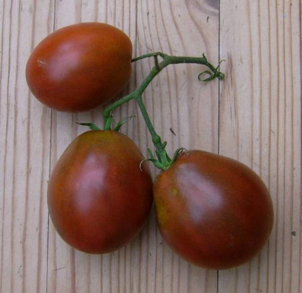 После того как появятся первые всходы и после высадки помидор в открытый грунт ждать урожая придется около 125 суток. Плоды имеют форму груши, небольшую ребристость и коричнево-бордовый оттенок кожуры. В среднем масса томата 60–80 грамм. Для этого удивительного сорта характерно длительное плодоношение. Использовать урожай можно для приготовления салатов со свежими овощами, заготовок на зиму или для томатного сока.