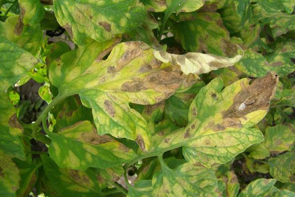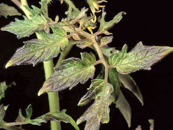 Грибковое заболевание, поражающее старые листья томатов. Нарушается выработка хлорофилла, поэтому листья блекнут и отмирают. Мицелии гриба устойчивы для перепадов температур и долго сохраняются в почве и на остатках растений. Позже заражаются корни и стебли. Болезнь распространяется снизу вверх до 1 м в высоту. Препаратов, полностью побеждающих споры грибов, нет. При выборе сортов помидоров надо обращать внимание на устойчивость к вертициллезу.
