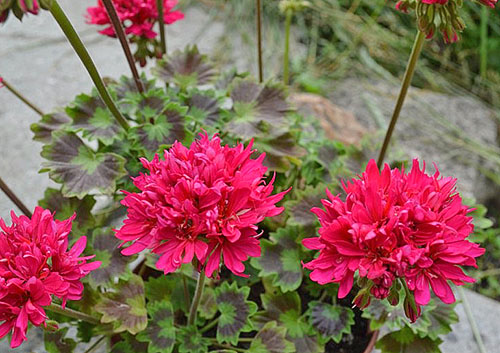 Необычная пестролистная пеларгония Vancouver Centennial не похожа ни на одно из описанных растений. Кто-то из цветоводов считает ее основным достоинством изящные соцветия-зонтики с алыми крошечными цветами в форме гвоздик. А кому-то больше по душе яркие бордово-фиолетовые листья с зеленой каймой по краю пластинки и вдоль жилок. Цветение обильное долгое, а листва, так и вовсе, круглогодично радует глаз.