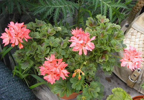 Еще один эффектный стеллар – это пеларгония Bronze Butterfly, отличающаяся яркими соцветиями из звездчатых цветков лососевого оттенка и декоративных листьев с темной фигурной зоной в центре листовой пластинки.