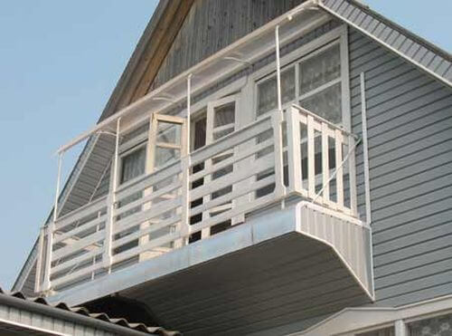 Если впоследствии вы думаете застеклить балкон – даче, на которой живут зимой, это необходимо, то нужно обязательно сооружать козырек, причем лучше сделать конструкцию со стойками по углам балкона, это упростит установку окон. Можно сделать и конструкцию попроще, используя профильную трубу, из которой сваривается конструкция нужного размера, а потом к ней крепится поликарбонат. Этот вариант хорош своей простотой и небольшим весом, он почти не создает дополнительной нагрузки на конструкцию;
