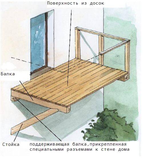Вынос опор может быть разным, если вам балкон нужен для того, чтобы сушить белье, вечером постоять и полюбоваться закатом или посидеть в кресле-качалке, то хватит ширины и в 800 мм. Если же вы хотите сделать его местом отдыха всей семьи и поставить столик, то нужно делать конструкцию пошире – примерно 120-150 см. Слишком большой вынос нежелателен, так как на несущие конструкции будет оказываться слишком большая нагрузка; -