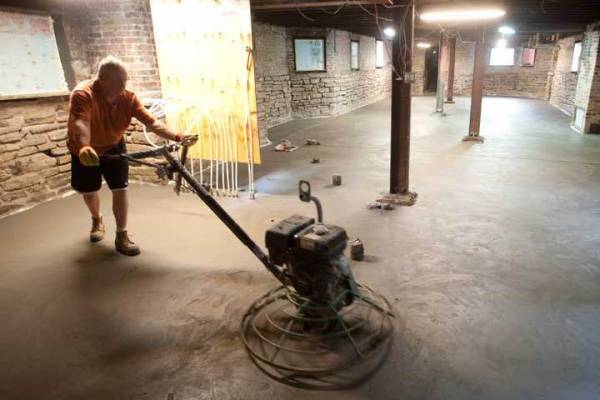 Налитый на пол бетон тщательно разравнивают длинным правилом. При использовании такой технологии покрытие в конечном итоге получается максимально ровным и аккуратным.