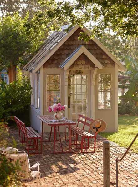 Домик для хранения инвентаря может быть оборудован мини-теплицей, а задняя часть спинки скамейки — отличное место для цветочного ящика в нарядном кашпо.