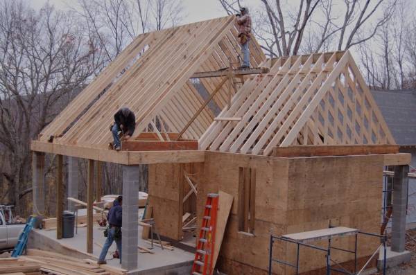 Главное – это создать конструкцию из стропил визуально прямоугольной формы. Благодаря высоте и системе построения осадки уходят самостоятельно. Создать ее несложно, но, по мнению мастеров, есть некие нюансы. Для реализации проекта нужны: