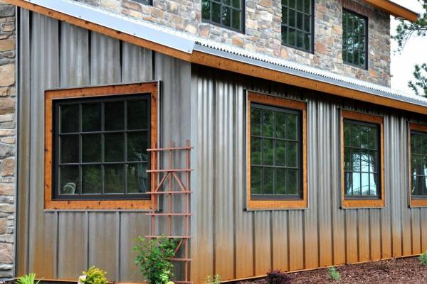 Тенденции современного оформления частных домов и коттеджей все больше тяготеют к принципам экологичности, естественности и натуральности. Этим обусловлено и возвращение традиционной деревянной обшивки в качестве средства фасадного оформления в разных вариациях. И на этом фоне металлическое покрытие существенно проигрывает, так как не создает образа природной фактуры и в экологическом отношении мало чем отличается от того же металлопластика. И все же, с точки зрения практичности, технология обшивки фасада профлистом является наиболее выгодной. Данная конструкция с эффектом вентиляции и слоем утеплителя способствует созданию благоприятного микроклимата в доме и оберегает стены от основных угроз. К тому же и по цене вентфасад из профлиста обходится достаточно дешево.