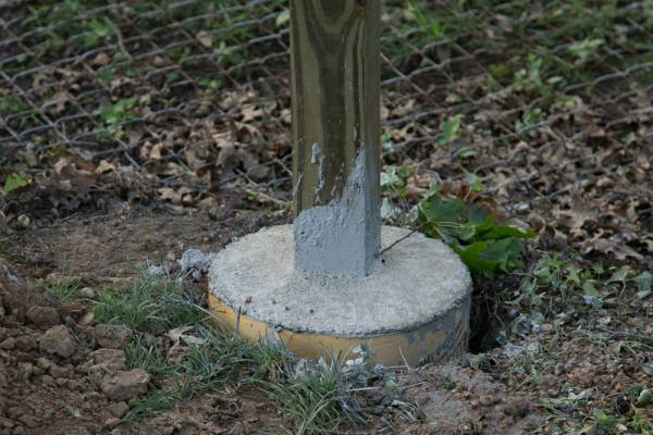 - По вертикали устанавливаются столбы с обеспечением надежной фиксации. Для крепления используется цементный раствор, которым необходимо залить каждую яму. Столбы оставляются на трое суток – это время застывания смеси.
