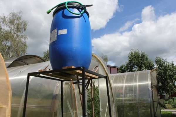 Бочка устанавливается на небольшой помост. Возвышение поможет придать нужного давления, чтобы вода могла доходить до отдаленных участков с капельницами. К ней монтируют кран, врезая его выше дна на несколько сантиметров.