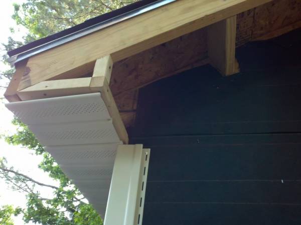 Установка данного элемента по большей части сводится к тыльной обшивке деревянными планками, пластиковыми панелями или сайдингом. Главное — не использовать в этой части металл, поскольку вывод конденсата через софиты создает благоприятные условия для коррозии. Как монтировать карнизный свес кровли? Когда контуры ската и мауэрлата определились и их конструкции готовы, можно приступать к инсталляции несущей обрешетки для подшивки. Желательно использовать мелкоформатный брус. Опорные части фиксируются шурупами к стене или мауэрлату – как позволит конструкция. По линиям несущих планок крепится ряд мелких планок с отступами примерно 20-30 см. На заключительном этапе по всей площади с тыльной стороны карниза выполняется обшивка – пластиком или деревянной вагонкой.