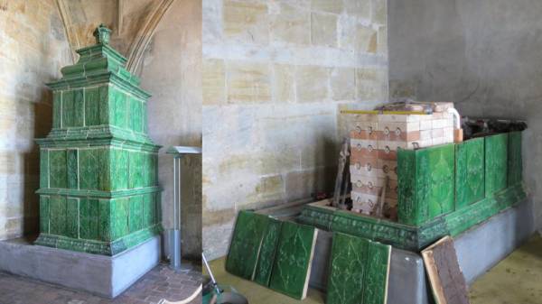 Особенностью такой плитки является необходимость правильного подбора перед началом монтажа. Каждый элемент отделки нужно подбирать по цвету. Изразцы сопоставляют между собой по форме, оттенку глазури. При необходимости неровные кромки шлифуют перед установкой. В конечном результате должен получиться ровный портал. Он станет настоящим шедевром.