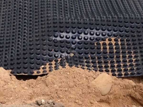 При сооружении мягкой отмостки ее верхним финишным покрытием могут быть утрамбованный гравий, зеленый газон или метлахская плитка. Разумеется, такие покрытия нуждаются в надежной гидроизоляционной подстраховке. Оптимальное решение вопроса – использование профилированной мембраны с заведением ее на стену дома. Она создаст герметичный слой, преградит проникновение атмосферных осадков к фундаменту.
