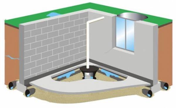 При обустройстве дренажной системы этой разновидности под зданием предусматривается воздушный зазор, изготавливаться который может по разным технологиям. Элементами же конструкции сетей этого типа, помимо труб и колодцев, являются:
