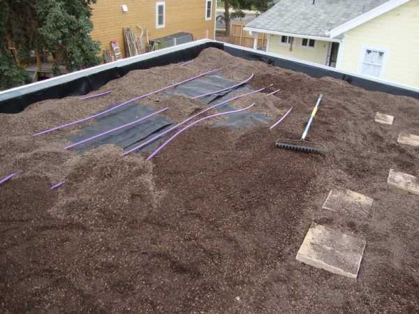 На плоской крыше можно выделить отдельный уголок, где будет располагаться зелёная зона. На этом участке из водонепроницаемой морозостойкой пленки, не содержащей вредных для растений веществ, сооружается плоская выемка, края которой поднимаются на 5 сантиметров. Бортики можно закрепить досками или камнями.