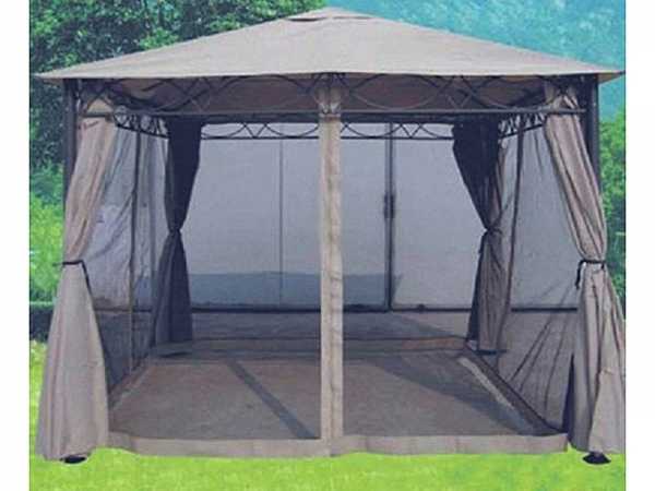 - беседка-шатёр — конструкция, аналогичная беседке, с боковыми стенками из ткани или москитной сетки, прикреплёнными к верхней горизонтальной части каркаса;