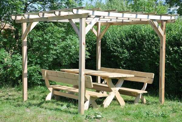 - дерево — самый доступный и экологичный каркас. В зависимости от толщины бруса или досок, используемых для постройки, можно построить как большой шатёр, так и лёгкую переносную конструкцию для большого количества гостей;
