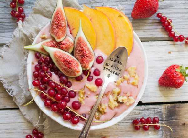 Налейте в миску, украсьте ломтиками персика, инжиром, смородиной и орехами. Наслаждайтесь!