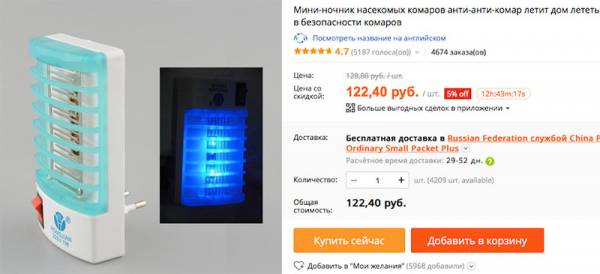 Стоимость электрической ловушки в отечественных магазинах примерно 1000 рублей, но любители выгодных покупок заказывают похожие устройства на сайте AliExpress. Производители из Поднебесной гарантируют эффективное уничтожение комаров всего лишь за 130 рублей.