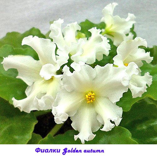 Сорта селекции Sorano – это всегда радость для цветовода. Крупные звездообразные цветы фиалки Golden autumn, кроме белого искрящегося оттенка, обладают изящно подвернутыми волнистыми лепестками, что придает цветку очень необычный вид. Окраска к центру венчика становится почти желтой, что подчеркивают тычинки такого же цвета. Розетка крепкая, стандартная. Листва яркая, зеленая, также с волнистым краем.