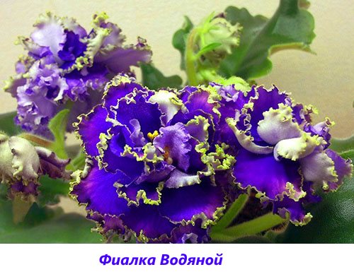 Причудливо извитые бахромчатые цветы сорта, полученного Т. Дадоян, имеют синюю фоновую окраску, которая к кайме заметно розовеет. Сама оборка на лепестках зеленая, яркая. А тыльная сторона венчика значительно светлее обращенной к зрителю. Фиалка Водяной, как на фото, обильно цветет, причем хорошую поддержку цветению оказывают и волнистые светлые листья.