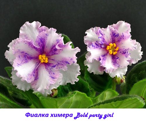 Полученная P. Sorano фиалка Bold party girl радует владельцев обилием махровых, сиренево-розовых цветков, напоминающих пышные оборчатые юбки танцовщиц. Форма цветка – звезда, в центре венчик имеет насыщенный оттенок фуксии, края более светлы, волнистые. По лепесткам рассыпаны синие штрихи и кляксы. Розетка стандартных размеров состоит из стеганой листвы простой формы и окраски.