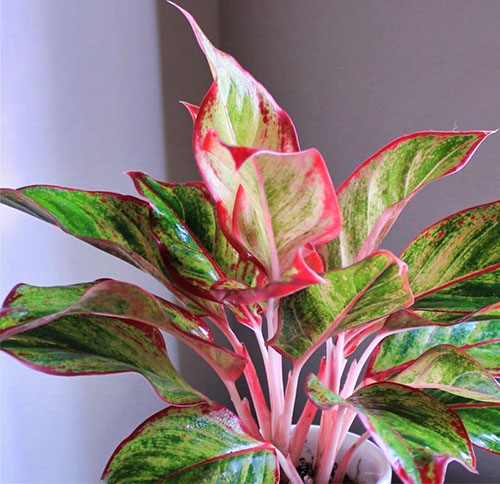 Окраска листьев аглаонемы сорта Автора Сиама, очень напоминая гамму вышеописанных растений, по сути, является их зеркальным отражением. Центр листовой пластинки пестрый, зеленый, а края и продольная жилка – малиновые или красные. Розовые и черешки, а также укороченный, почти незаметный ствол растения.