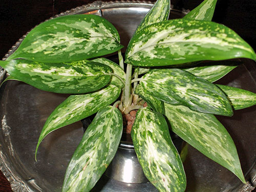 Растения этого популярного вида аглаонемы достигают метровой высоты. При этом ствол густо покрыт яркой эллиптической листвой почти серебристой окраски. Зеленые штрихи на листовых пластинах заметны лишь по самому краю и вдоль продольной жилки. Длина такого красивого листа обычно доходит до 30 см. Его край может быть немного волнистым.