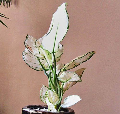 Декоративный низкорослый вид аглаонемы выделяется сердцевидной заостренной листвой темного зеленого оттенка. На листьях очень ярко и необычно выглядят тонкие, проходящие вдоль прожилок полосы. Цвет таких «украшений» в зависимости от сорта аглаонемы, варьируется от белого до ярко малинового.