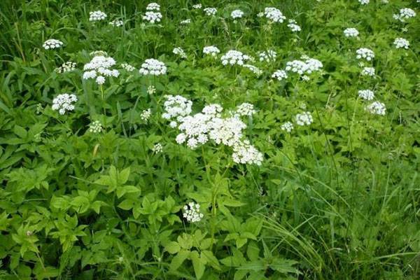 Цветет трава очень красиво. Бутоны собраны в широкие зонтики. В каждом из них может находиться от 15 до 20 цветочков. В растениях, которым выполнился не один десяток лет, может быть от 300 до 500 раскрывшихся бутонов. Цветочки белоснежные и состоят они с 5 пяти лепесточков. По окончании цветения формируются плоды. Все они имеют удлиненную форму с ярко выраженными ребрами. Спелые зерна бурого оттенка.