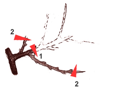 Осенью же приступают к формированию будущего плодоносящего куста. Выросшие за сезон молодые побеги из оставленной прошлогодней лозы нужно обрезать на разной высоте. Один, более короткий (из 3-5 почек), оставляют на сучок замещения. Второй, более длинный (от 6 до 10 почек), оставляют на стрелку плодоношения.