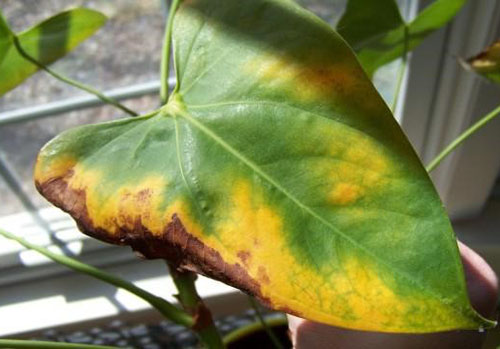 Болезни листьев антуриума на фото показывают характерные повреждения, но зачастую для точного определения недуга требуется помощь специалистов. Губительны для растения сквозняки. Особенно опасно это зимой. Недостаточная влажность окружающего воздуха служит ответом на вопрос, почему сохнут листья у антуриума. С другой стороны, листья могут отмирать естественно, вследствие старения. Если же листья свернулись в трубочку, уберите антуриум вглубь помещения, слишком яркий свет, он зажмурился.