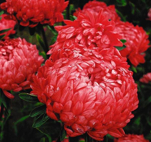 Пионовидную форму цветков имеет и астра красная башня. Названием она обязан ярко-красному бутону, который очень выгодно выделяется в солнечных лучах. Цветки астры очень пушистые и объемные, шарообразной формы. Они в диаметре достигают 10 см. Куст растения во взрослом виде приобретает форму пирамиды. Это осенние цветы, радующие глаз в августе-сентябре. Высаживать такие астры следует в предварительно подкормленную почву, лучше, в чернозем.
