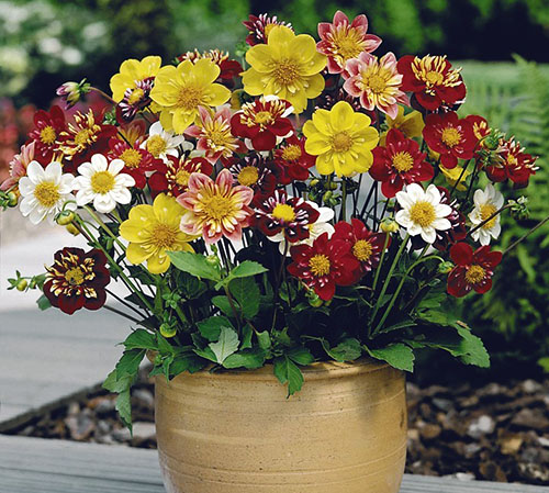 Это смесь сортов, которые подбираются для посадки в открытом грунте. Это очень декоративные кусты, неприхотливые к условиям содержания и климату. В продаже можно найти микс помпонных, кактусовых и других георгин. Период их цветения совпадает, а бутоны не прекращают распускаться с июля до начала осени.