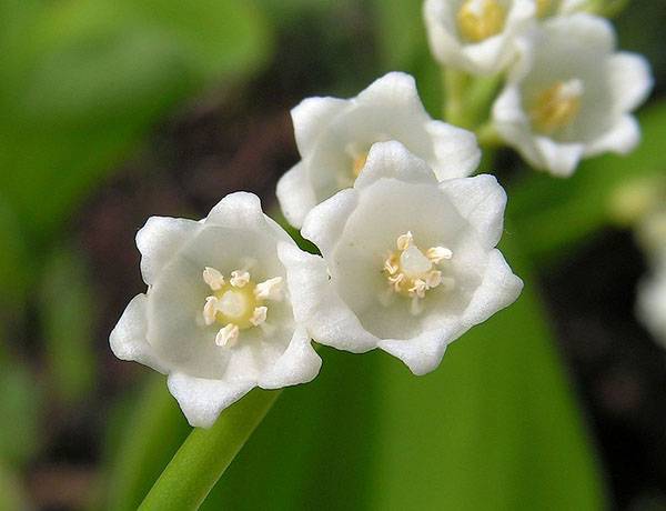 Первые ландыши раскрываются на нижней части стебля, затем наступает очередь средних и верхних бутонов.