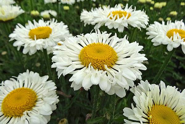 Ромашки вместе с васильками традиционно считаются символом российских просторов. Садовые разновидности нивяника – это те же ромашки, только намного крупнее и выразительнее. Простые и махровые соцветия-корзинки венчают прямостоячие стебли высотой от 30 до 100 см.