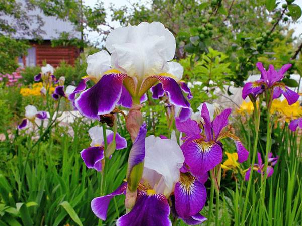 Цветоносные побеги ирисов на 40–80 см поднимаются над землей. Белые, желтые, розовые, пурпурные, кремовые, синие или голубые цветы отлично украшают сад и идеальны для срезки.