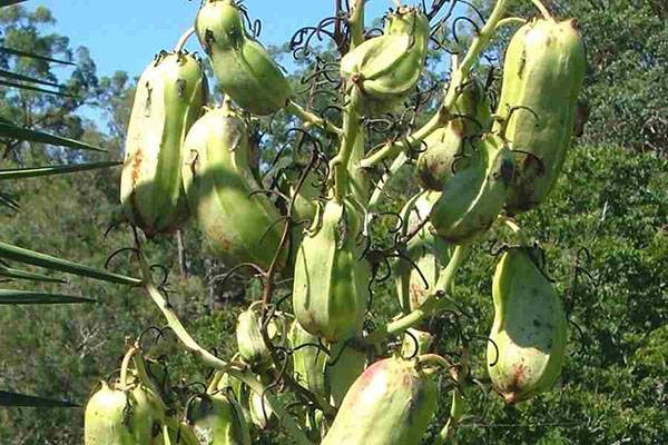 Метельчатые соцветия появляются только на взрослых экземплярах. Раскрывающиеся летом белые цветки после опыления превращаются в овальные мясистые плоды длиной от 2 до 3 м.